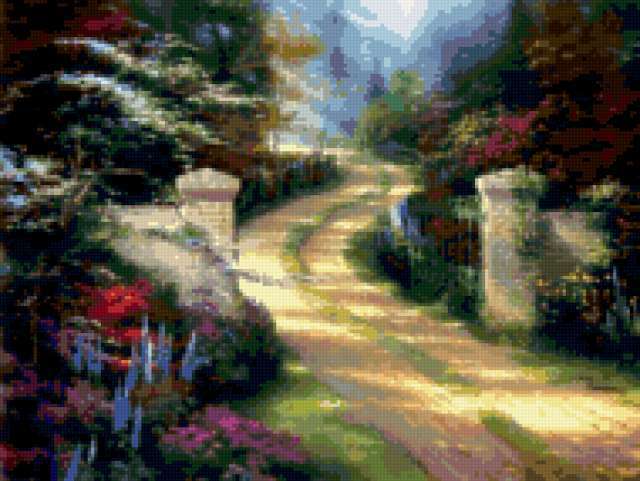 Ориентировочно так, схема вышивки «Thomas Kinkade», созданная автором iborissova, будет выглядеть при отшиве на канве. Размер данной вышивки равен 190x143 крестов, при этом используется 82 цветов. Ключевые слова, по которым можно найти эту схему: природа, пейзаж. Также, вы можете взглянуть на оригинальную картинку, соответствующую данной схеме вышивки.