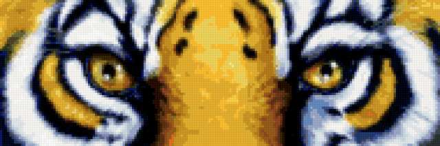 Ориентировочно так, схема вышивки «Tiger Eyes», созданная автором pandreevska, будет выглядеть при отшиве на канве. Размер данной вышивки равен 190x63 крестов, при этом используется 52 цветов. Ключевые слова, по которым можно найти эту схему: животные, animals, tiger. Также, вы можете взглянуть на оригинальную картинку, соответствующую данной схеме вышивки.