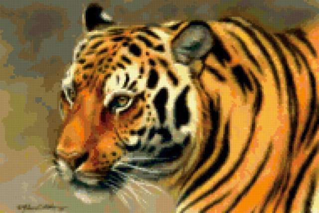 Ориентировочно так, схема вышивки «Tiger», созданная автором aniela, будет выглядеть при отшиве на канве. Размер данной вышивки равен 190x127 крестов, при этом используется 76 цветов. Ключевые слова, по которым можно найти эту схему: wildlife, animals, животные, тигр. Также, вы можете взглянуть на оригинальную картинку, соответствующую данной схеме вышивки.