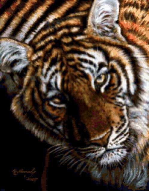 Ориентировочно так, схема вышивки «Tiger», созданная автором aniela, будет выглядеть при отшиве на канве. Размер данной вышивки равен 148x190 крестов, при этом используется 68 цветов. Ключевые слова, по которым можно найти эту схему: wildlife, animals, животные, тигр. Также, вы можете взглянуть на оригинальную картинку, соответствующую данной схеме вышивки.