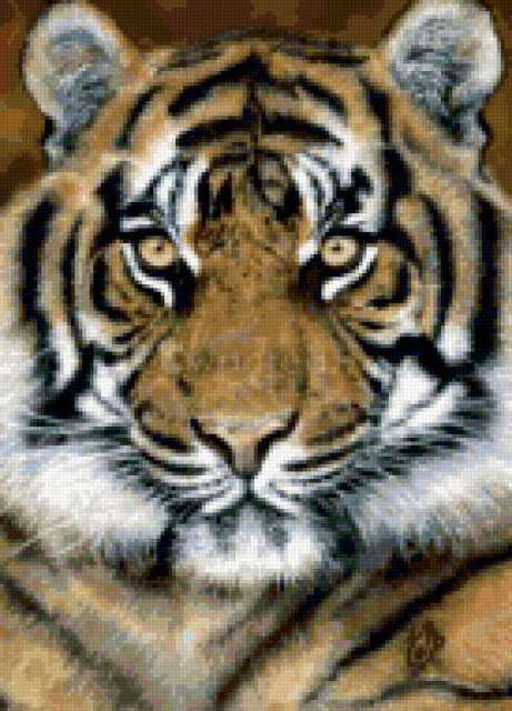 Ориентировочно так, схема вышивки «Tiger», созданная автором aniela, будет выглядеть при отшиве на канве. Размер данной вышивки равен 137x190 крестов, при этом используется 70 цветов. Ключевые слова, по которым можно найти эту схему: wildlife, animals, животные, тигр. Также, вы можете взглянуть на оригинальную картинку, соответствующую данной схеме вышивки.