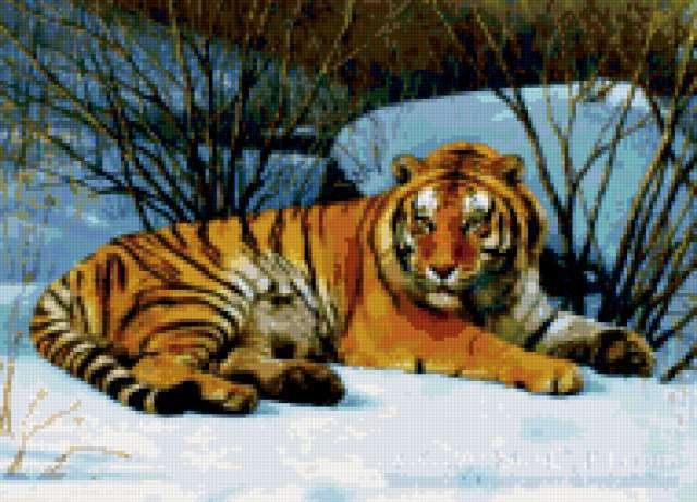 Ориентировочно так, схема вышивки «Tiger», созданная автором aniela, будет выглядеть при отшиве на канве. Размер данной вышивки равен 190x137 крестов, при этом используется 69 цветов. Ключевые слова, по которым можно найти эту схему: wildlife, animals, животные, тигр. Также, вы можете взглянуть на оригинальную картинку, соответствующую данной схеме вышивки.