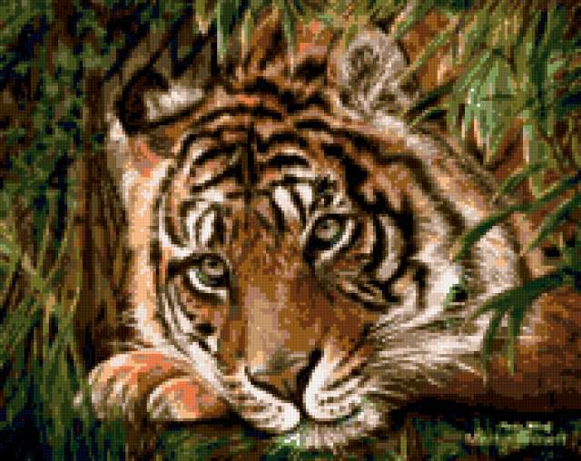 Ориентировочно так, схема вышивки «Tigr», созданная автором lukrecija12, будет выглядеть при отшиве на канве. Размер данной вышивки равен 190x151 крестов, при этом используется 30 цветов. Ключевые слова, по которым можно найти эту схему: zivotnye. Также, вы можете взглянуть на оригинальную картинку, соответствующую данной схеме вышивки.