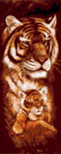 Ориентировочно так, схема вышивки «Tigry», созданная автором lukrecija12, будет выглядеть при отшиве на канве. Размер данной вышивки равен 76x190 крестов, при этом используется 42 цветов. Ключевые слова, по которым можно найти эту схему: zivotnye. Также, вы можете взглянуть на оригинальную картинку, соответствующую данной схеме вышивки.