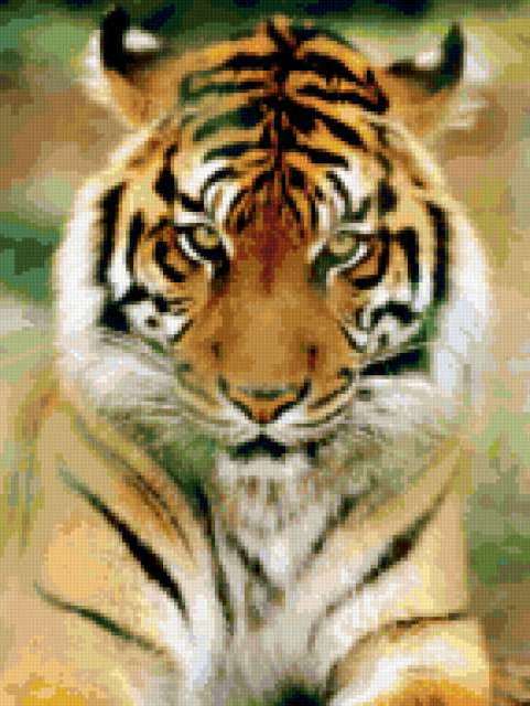 Ориентировочно так, схема вышивки «Tiiger», созданная автором aniela, будет выглядеть при отшиве на канве. Размер данной вышивки равен 143x190 крестов, при этом используется 82 цветов. Ключевые слова, по которым можно найти эту схему: Wildlife, animals, Животные, тигр. Также, вы можете взглянуть на оригинальную картинку, соответствующую данной схеме вышивки.