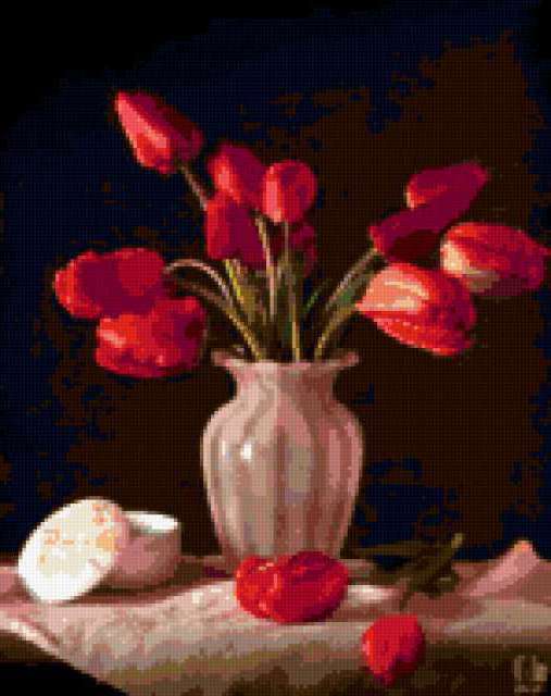 Ориентировочно так, схема вышивки «Tiulpany», созданная автором lukrecija12, будет выглядеть при отшиве на канве. Размер данной вышивки равен 149x188 крестов, при этом используется 45 цветов. Ключевые слова, по которым можно найти эту схему: cvety. Также, вы можете взглянуть на оригинальную картинку, соответствующую данной схеме вышивки.
