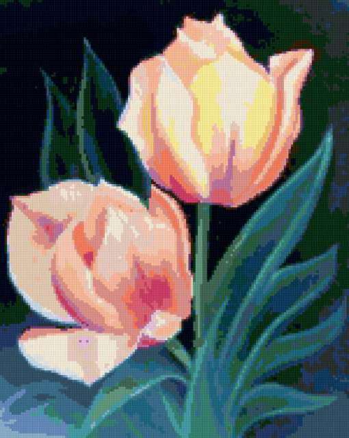 Ориентировочно так, схема вышивки «Tiulpany», созданная автором lukrecija12, будет выглядеть при отшиве на канве. Размер данной вышивки равен 150x188 крестов, при этом используется 36 цветов. Ключевые слова, по которым можно найти эту схему: cvety. Также, вы можете взглянуть на оригинальную картинку, соответствующую данной схеме вышивки.