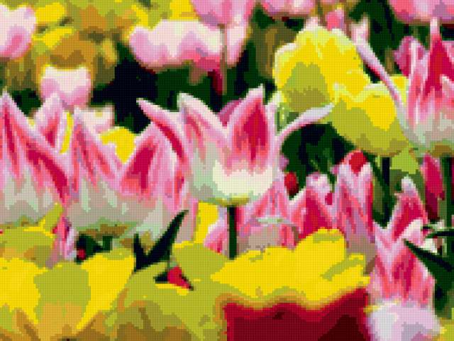 Ориентировочно так, схема вышивки «Tiulpany», созданная автором lukrecija12, будет выглядеть при отшиве на канве. Размер данной вышивки равен 190x143 крестов, при этом используется 57 цветов. Ключевые слова, по которым можно найти эту схему: cvety. Также, вы можете взглянуть на оригинальную картинку, соответствующую данной схеме вышивки.