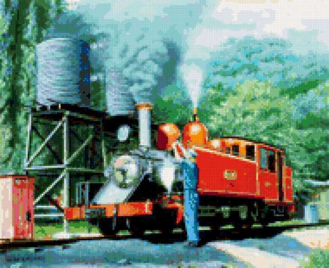 Ориентировочно так, схема вышивки «Train», созданная автором aniela, будет выглядеть при отшиве на канве. Размер данной вышивки равен 190x155 крестов, при этом используется 73 цветов. Ключевые слова, по которым можно найти эту схему: train. Также, вы можете взглянуть на оригинальную картинку, соответствующую данной схеме вышивки.