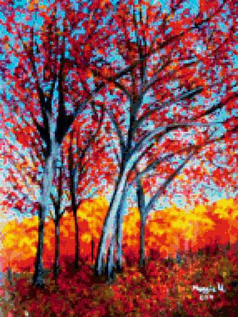 Ориентировочно так, схема вышивки «Tree», созданная автором aniela, будет выглядеть при отшиве на канве. Размер данной вышивки равен 143x190 крестов, при этом используется 78 цветов. Ключевые слова, по которым можно найти эту схему: пейзаж, landscape, tree. Также, вы можете взглянуть на оригинальную картинку, соответствующую данной схеме вышивки.