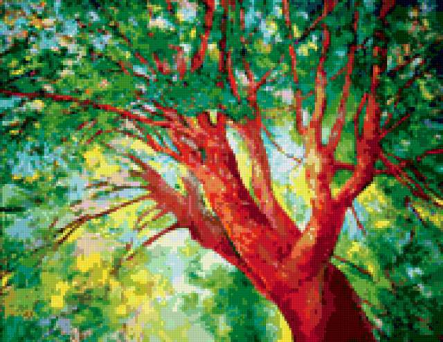 Ориентировочно так, схема вышивки «Tree», созданная автором aniela, будет выглядеть при отшиве на канве. Размер данной вышивки равен 190x147 крестов, при этом используется 79 цветов. Ключевые слова, по которым можно найти эту схему: пейзаж, landscape, tree. Также, вы можете взглянуть на оригинальную картинку, соответствующую данной схеме вышивки.