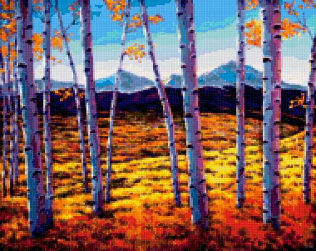Ориентировочно так, схема вышивки «Trees», созданная автором aniela, будет выглядеть при отшиве на канве. Размер данной вышивки равен 190x151 крестов, при этом используется 83 цветов. Ключевые слова, по которым можно найти эту схему: пейзаж, landscape, tree. Также, вы можете взглянуть на оригинальную картинку, соответствующую данной схеме вышивки.