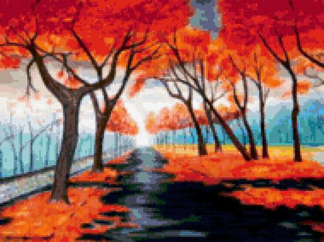 Ориентировочно так, схема вышивки «Trees», созданная автором aniela, будет выглядеть при отшиве на канве. Размер данной вышивки равен 190x142 крестов, при этом используется 81 цветов. Ключевые слова, по которым можно найти эту схему: пейзаж, landscape, tree. Также, вы можете взглянуть на оригинальную картинку, соответствующую данной схеме вышивки.