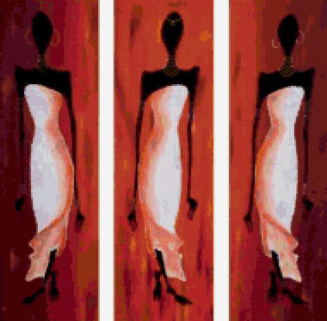 Ориентировочно так, схема вышивки «Triptych», созданная автором iborissova, будет выглядеть при отшиве на канве. Размер данной вышивки равен 190x187 крестов, при этом используется 47 цветов. Ключевые слова, по которым можно найти эту схему: женщина. Также, вы можете взглянуть на оригинальную картинку, соответствующую данной схеме вышивки.