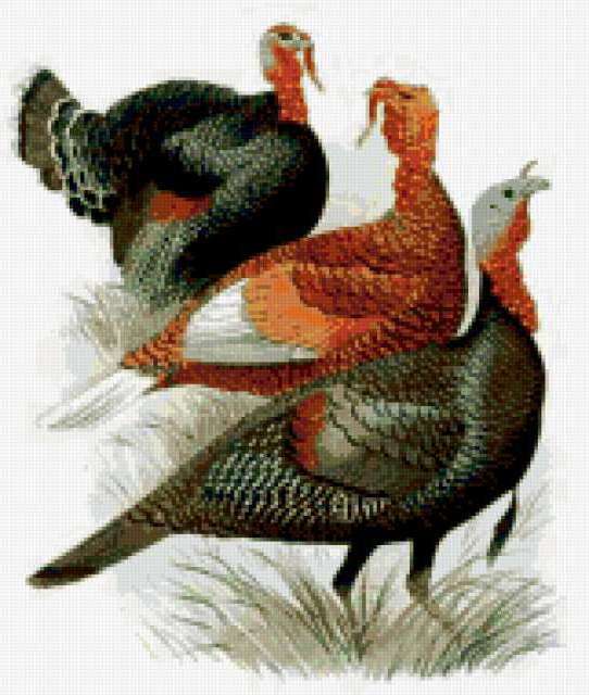 Ориентировочно так, схема вышивки «Turkey», созданная автором iborissova, будет выглядеть при отшиве на канве. Размер данной вышивки равен 161x190 крестов, при этом используется 46 цветов. Ключевые слова, по которым можно найти эту схему: птици. Также, вы можете взглянуть на оригинальную картинку, соответствующую данной схеме вышивки.