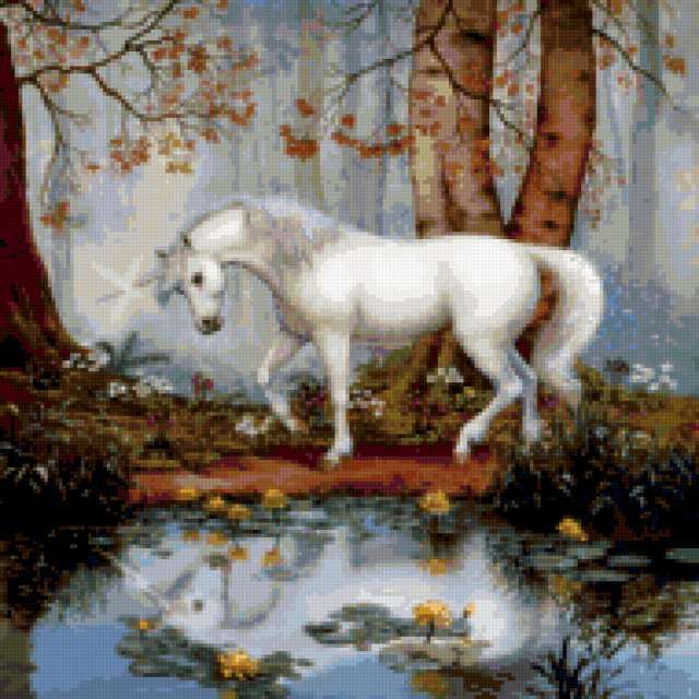Ориентировочно так, схема вышивки «Unicorn», созданная автором aniela, будет выглядеть при отшиве на канве. Размер данной вышивки равен 190x190 крестов, при этом используется 75 цветов. Ключевые слова, по которым можно найти эту схему: фэнтези, fantasy, unicorn. Также, вы можете взглянуть на оригинальную картинку, соответствующую данной схеме вышивки.