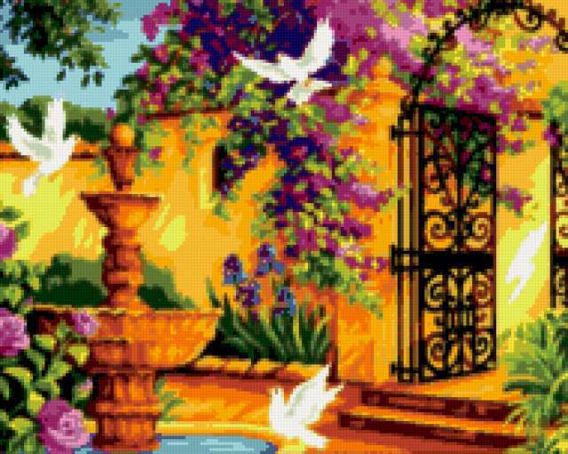 Ориентировочно так, схема вышивки «Unnamed-1005061», созданная автором malkinaiv, будет выглядеть при отшиве на канве. Размер данной вышивки равен 190x152 крестов, при этом используется 67 цветов. Ключевые слова, по которым можно найти эту схему: искусство, живопись, картина, пейзаж, сады, парки, цветы, цветник, калитка, птицы, голуби. Также, вы можете взглянуть на оригинальную картинку, соответствующую данной схеме вышивки.