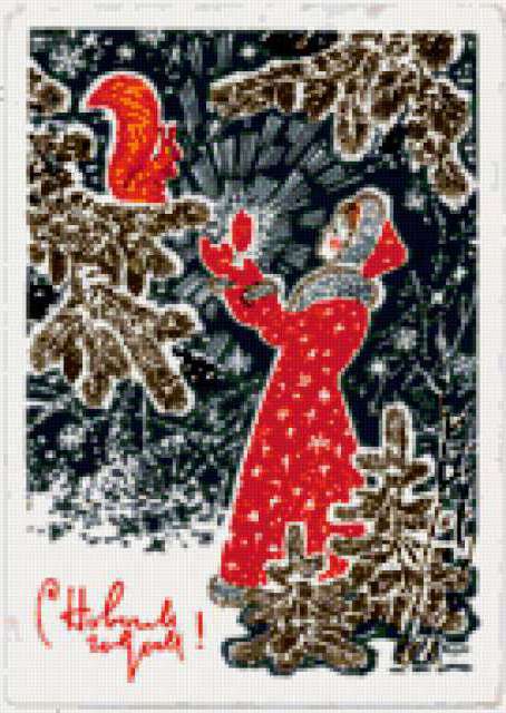 Ориентировочно так, схема вышивки «Unnamed-1007529», созданная автором malkinaiv, будет выглядеть при отшиве на канве. Размер данной вышивки равен 135x190 крестов, при этом используется 47 цветов. Ключевые слова, по которым можно найти эту схему: новый год, елки, белка, снег, снегурочка. Также, вы можете взглянуть на оригинальную картинку, соответствующую данной схеме вышивки.