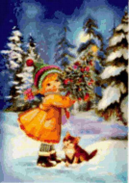 Ориентировочно так, схема вышивки «Unnamed-1007554», созданная автором malkinaiv, будет выглядеть при отшиве на канве. Размер данной вышивки равен 134x190 крестов, при этом используется 86 цветов. Ключевые слова, по которым можно найти эту схему: новый год, девочка, елки, котенок, снег, сугробы. Также, вы можете взглянуть на оригинальную картинку, соответствующую данной схеме вышивки.