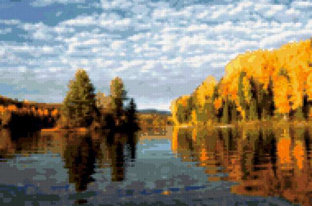 Ориентировочно так, схема вышивки «Unnamed-1014630», созданная автором burova, будет выглядеть при отшиве на канве. Размер данной вышивки равен 190x126 крестов, при этом используется 58 цветов. Ключевые слова, по которым можно найти эту схему: пейзаж, природа, река, берега, осень, деревья, отражения. Также, вы можете взглянуть на оригинальную картинку, соответствующую данной схеме вышивки.