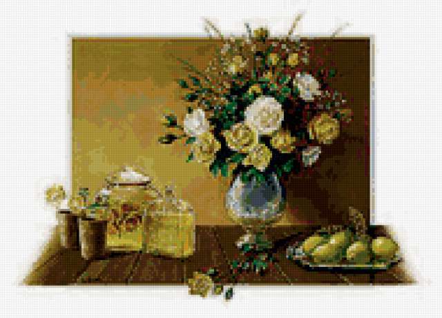 Ориентировочно так, схема вышивки «Unnamed-1014916», созданная автором v_timofeeva, будет выглядеть при отшиве на канве. Размер данной вышивки равен 190x137 крестов, при этом используется 73 цветов. К несчастью, автор не назначил для схемы ключевые слова. Также, вы можете взглянуть на оригинальную картинку, соответствующую данной схеме вышивки.