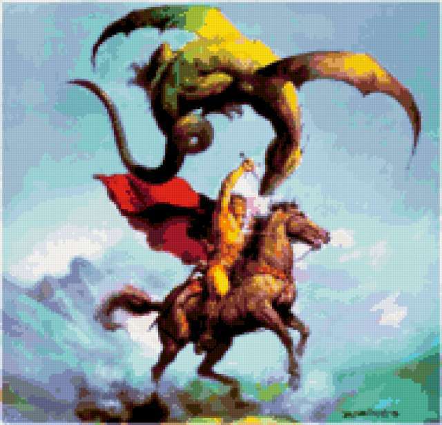 Ориентировочно так, схема вышивки «Unnamed-101856», созданная автором malkinaiv, будет выглядеть при отшиве на канве. Размер данной вышивки равен 190x183 крестов, при этом используется 70 цветов. Ключевые слова, по которым можно найти эту схему: фэнтези, люди, лошади, драконы. Также, вы можете взглянуть на оригинальную картинку, соответствующую данной схеме вышивки.