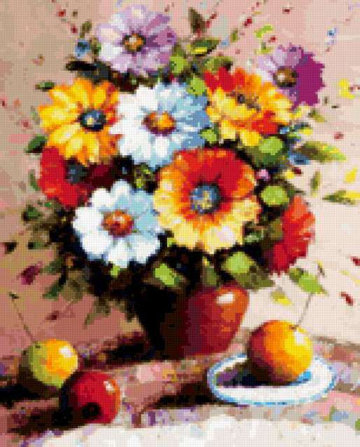 Ориентировочно так, схема вышивки «Unnamed-1031193», созданная автором 21natasha1982, будет выглядеть при отшиве на канве. Размер данной вышивки равен 153x190 крестов, при этом используется 82 цветов. К несчастью, автор не назначил для схемы ключевые слова. Также, вы можете взглянуть на оригинальную картинку, соответствующую данной схеме вышивки.