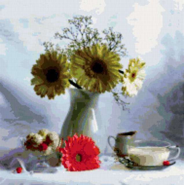 Ориентировочно так, схема вышивки «Unnamed-1053441», созданная автором malkinaiv, будет выглядеть при отшиве на канве. Размер данной вышивки равен 189x190 крестов, при этом используется 77 цветов. Ключевые слова, по которым можно найти эту схему: натюрморт, цветы, букет. Также, вы можете взглянуть на оригинальную картинку, соответствующую данной схеме вышивки.