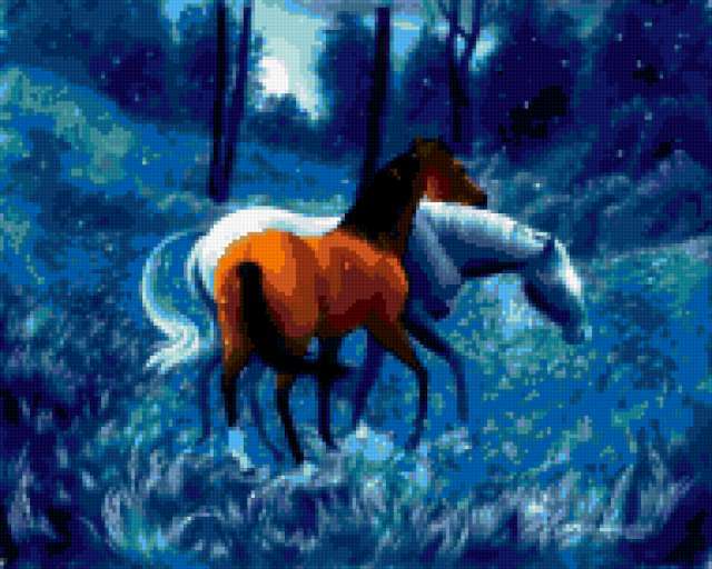 Ориентировочно так, схема вышивки «Unnamed-1068394», созданная автором malkinaiv, будет выглядеть при отшиве на канве. Размер данной вышивки равен 190x152 крестов, при этом используется 45 цветов. Ключевые слова, по которым можно найти эту схему: искусство, живопись, картина, пейзаж, ночь, лошади, кони. Также, вы можете взглянуть на оригинальную картинку, соответствующую данной схеме вышивки.