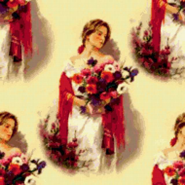 Ориентировочно так, схема вышивки «Unnamed-1078235», созданная автором burova, будет выглядеть при отшиве на канве. Размер данной вышивки равен 190x190 крестов, при этом используется 67 цветов. Ключевые слова, по которым можно найти эту схему: подушка, подушки, девушка, девушки, цветы, букеты. Также, вы можете взглянуть на оригинальную картинку, соответствующую данной схеме вышивки.