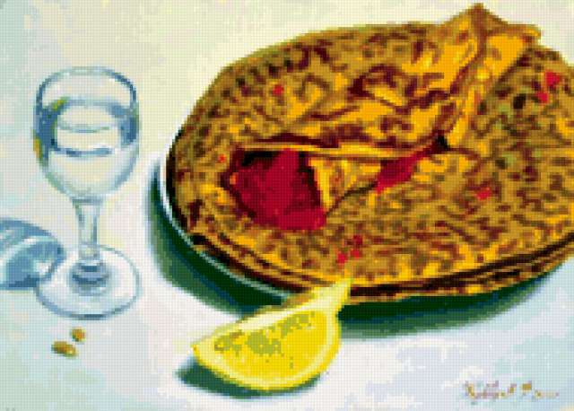 Ориентировочно так, схема вышивки «Unnamed-1079946», созданная автором chokolat, будет выглядеть при отшиве на канве. Размер данной вышивки равен 190x136 крестов, при этом используется 74 цветов. Ключевые слова, по которым можно найти эту схему: масленица, для кухни. Также, вы можете взглянуть на оригинальную картинку, соответствующую данной схеме вышивки.