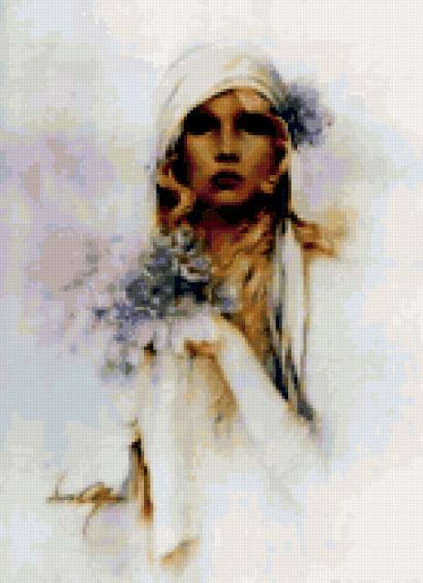 Ориентировочно так, схема вышивки «Unnamed-1079992», созданная автором chokolat, будет выглядеть при отшиве на канве. Размер данной вышивки равен 138x190 крестов, при этом используется 64 цветов. Ключевые слова, по которым можно найти эту схему: портрет, дама, девушка. Также, вы можете взглянуть на оригинальную картинку, соответствующую данной схеме вышивки.