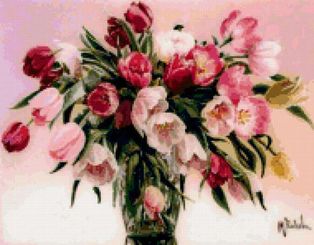 Ориентировочно так, схема вышивки «Unnamed-1084615», созданная автором ibyibkkf, будет выглядеть при отшиве на канве. Размер данной вышивки равен 190x148 крестов, при этом используется 85 цветов. Ключевые слова, по которым можно найти эту схему: цветы в вазе. Также, вы можете взглянуть на оригинальную картинку, соответствующую данной схеме вышивки.