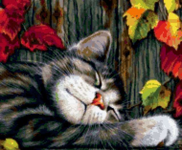 Ориентировочно так, схема вышивки «Unnamed-1096054», созданная автором anor, будет выглядеть при отшиве на канве. Размер данной вышивки равен 190x157 крестов, при этом используется 71 цветов. Ключевые слова, по которым можно найти эту схему: кошка, кошки, картина, кот, сон. Также, вы можете взглянуть на оригинальную картинку, соответствующую данной схеме вышивки.