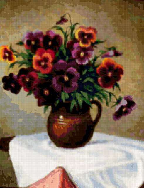 Ориентировочно так, схема вышивки «Unnamed-1134275», созданная автором Nataly_L, будет выглядеть при отшиве на канве. Размер данной вышивки равен 146x190 крестов, при этом используется 76 цветов. Ключевые слова, по которым можно найти эту схему: анютины глазки, цветы, виола. Также, вы можете взглянуть на оригинальную картинку, соответствующую данной схеме вышивки.