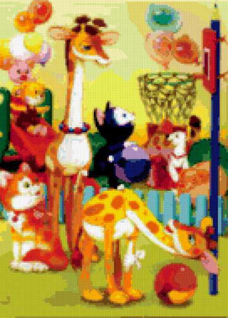 Ориентировочно так, схема вышивки «Unnamed-1140866», созданная автором malkinaiv, будет выглядеть при отшиве на канве. Размер данной вышивки равен 136x190 крестов, при этом используется 77 цветов. Ключевые слова, по которым можно найти эту схему: иллюстрации, сказки, животные, жираф, кошки, детям, в детскую, для детей. Также, вы можете взглянуть на оригинальную картинку, соответствующую данной схеме вышивки.