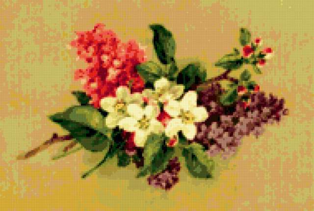 Ориентировочно так, схема вышивки «Unnamed-1141293», созданная автором burova, будет выглядеть при отшиве на канве. Размер данной вышивки равен 190x128 крестов, при этом используется 46 цветов. Ключевые слова, по которым можно найти эту схему: цветы, букет, сирень. Также, вы можете взглянуть на оригинальную картинку, соответствующую данной схеме вышивки.