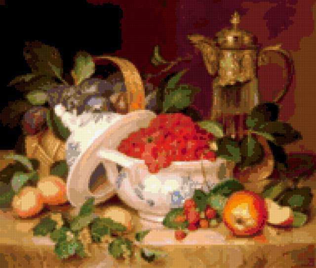 Ориентировочно так, схема вышивки «Unnamed-1142086», созданная автором malkinaiv, будет выглядеть при отшиве на канве. Размер данной вышивки равен 190x161 крестов, при этом используется 75 цветов. Ключевые слова, по которым можно найти эту схему: искусство, живопись, картина, натюрморт, ягоды, фрукты. Также, вы можете взглянуть на оригинальную картинку, соответствующую данной схеме вышивки.