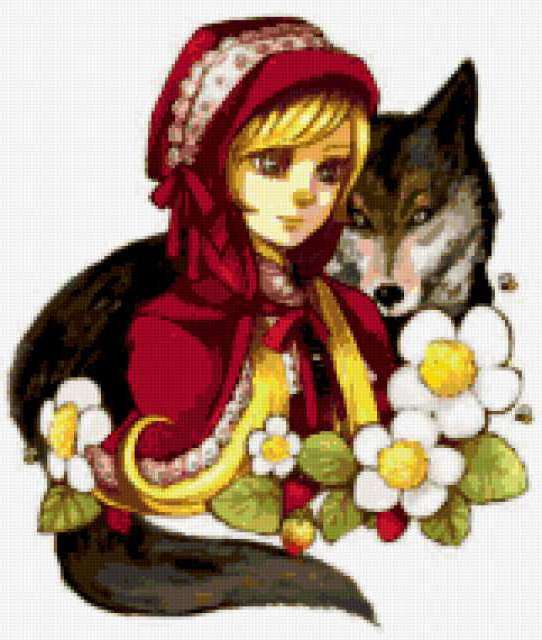 Ориентировочно так, схема вышивки «Unnamed-1142828», созданная автором allllla, будет выглядеть при отшиве на канве. Размер данной вышивки равен 161x190 крестов, при этом используется 65 цветов. Ключевые слова, по которым можно найти эту схему: красная шапочка, волк, сказка, мультик, детям, картина, аниме. Также, вы можете взглянуть на оригинальную картинку, соответствующую данной схеме вышивки.