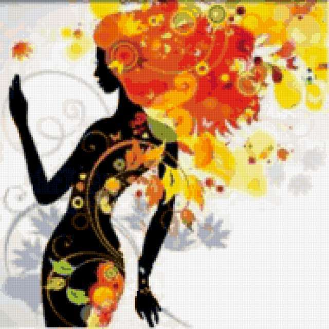 Ориентировочно так, схема вышивки «Unnamed-1142923», созданная автором chokolat, будет выглядеть при отшиве на канве. Размер данной вышивки равен 190x190 крестов, при этом используется 75 цветов. Ключевые слова, по которым можно найти эту схему: дама, девушка, осень. Также, вы можете взглянуть на оригинальную картинку, соответствующую данной схеме вышивки.