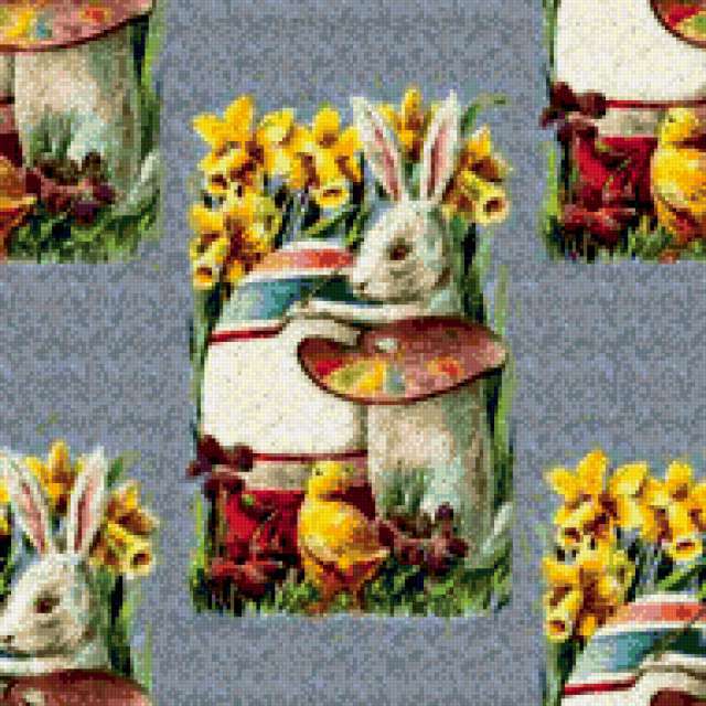Ориентировочно так, схема вышивки «Unnamed-1149750», созданная автором burova, будет выглядеть при отшиве на канве. Размер данной вышивки равен 190x190 крестов, при этом используется 86 цветов. Ключевые слова, по которым можно найти эту схему: подушка, подушки, кролик, птенцы, цыплята, птицы, нарциссы, цветы, яйца. Также, вы можете взглянуть на оригинальную картинку, соответствующую данной схеме вышивки.