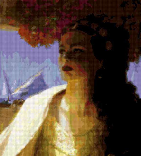 Ориентировочно так, схема вышивки «Unnamed-1155918», созданная автором chokolat, будет выглядеть при отшиве на канве. Размер данной вышивки равен 172x190 крестов, при этом используется 63 цветов. Ключевые слова, по которым можно найти эту схему: дама, девушка. Также, вы можете взглянуть на оригинальную картинку, соответствующую данной схеме вышивки.
