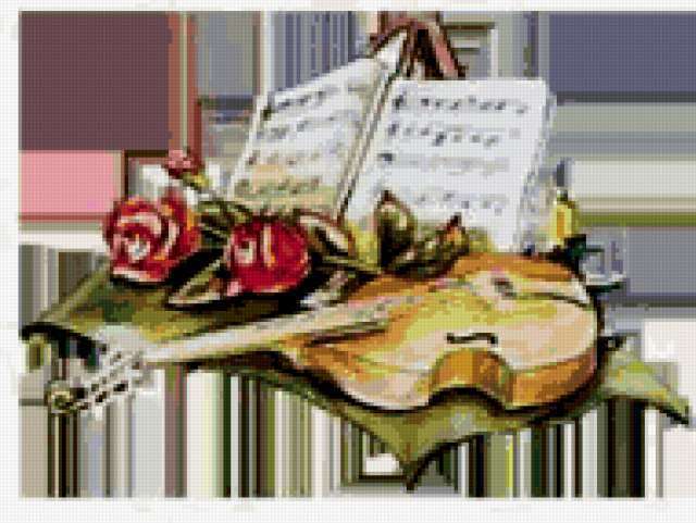 Ориентировочно так, схема вышивки «Unnamed-1182271», созданная автором burova, будет выглядеть при отшиве на канве. Размер данной вышивки равен 190x143 крестов, при этом используется 81 цветов. Ключевые слова, по которым можно найти эту схему: натюрморт, цветы, скрипка, розы, ноты, музыка. Также, вы можете взглянуть на оригинальную картинку, соответствующую данной схеме вышивки.