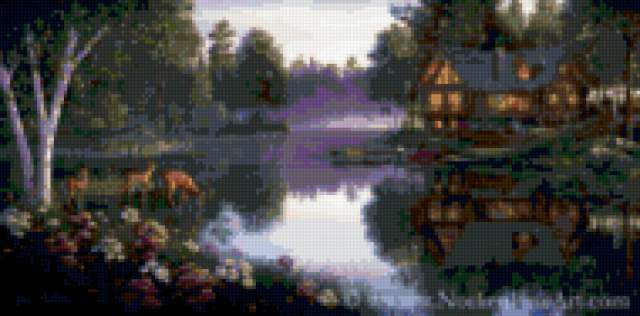 Ориентировочно так, схема вышивки «Unnamed-1187019», созданная автором malkinaiv, будет выглядеть при отшиве на канве. Размер данной вышивки равен 190x94 крестов, при этом используется 60 цветов. Ключевые слова, по которым можно найти эту схему: искусство, живопись, картина, озеро, пейзаж, природа, животные, олени, дома, цветы, деревья, отражения. Также, вы можете взглянуть на оригинальную картинку, соответствующую данной схеме вышивки.