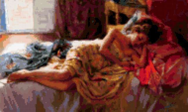 Ориентировочно так, схема вышивки «Unnamed-1196346», созданная автором malkinaiv, будет выглядеть при отшиве на канве. Размер данной вышивки равен 190x113 крестов, при этом используется 76 цветов. Ключевые слова, по которым можно найти эту схему: искусство, живопись, картина, девушка, комната. Также, вы можете взглянуть на оригинальную картинку, соответствующую данной схеме вышивки.