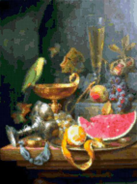 Ориентировочно так, схема вышивки «Unnamed-1199455», созданная автором malkinaiv, будет выглядеть при отшиве на канве. Размер данной вышивки равен 142x190 крестов, при этом используется 82 цветов. Ключевые слова, по которым можно найти эту схему: искусство, живопись, картина, натюрморт, фрукты, вино. Также, вы можете взглянуть на оригинальную картинку, соответствующую данной схеме вышивки.