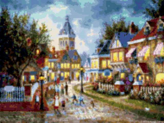 Ориентировочно так, схема вышивки «Unnamed-1200952», созданная автором poganka, будет выглядеть при отшиве на канве. Размер данной вышивки равен 190x143 крестов, при этом используется 85 цветов. Ключевые слова, по которым можно найти эту схему: пейзаж, город, дома, улица, цветы, цветник, дворик, люди. Также, вы можете взглянуть на оригинальную картинку, соответствующую данной схеме вышивки.