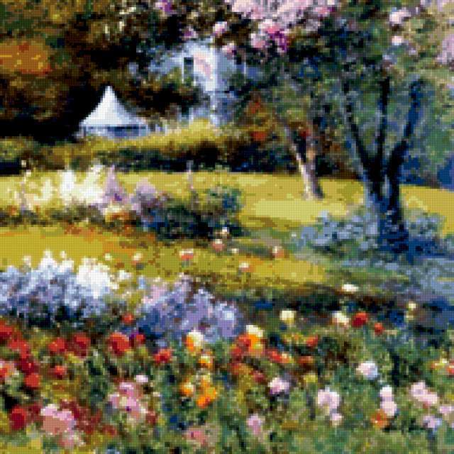 Ориентировочно так, схема вышивки «Unnamed-1203580», созданная автором malkinaiv, будет выглядеть при отшиве на канве. Размер данной вышивки равен 190x190 крестов, при этом используется 86 цветов. Ключевые слова, по которым можно найти эту схему: искусство, живопись, картина, пейзаж, цветы, цветник, сады, парки, деревья, дома, лето. Также, вы можете взглянуть на оригинальную картинку, соответствующую данной схеме вышивки.