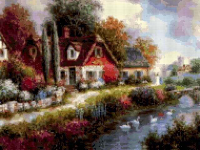 Ориентировочно так, схема вышивки «Unnamed-1208262», созданная автором poganka, будет выглядеть при отшиве на канве. Размер данной вышивки равен 190x143 крестов, при этом используется 83 цветов. Ключевые слова, по которым можно найти эту схему: искусство, пейзаж, дома, цветы, цветник, река, птицы, живопись. Также, вы можете взглянуть на оригинальную картинку, соответствующую данной схеме вышивки.