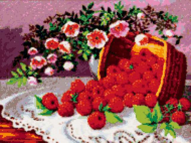 Ориентировочно так, схема вышивки «Unnamed-1213346», созданная автором anor, будет выглядеть при отшиве на канве. Размер данной вышивки равен 190x142 крестов, при этом используется 49 цветов. Ключевые слова, по которым можно найти эту схему: ягоды, картина, клубника, малина, для кухни, серия. Также, вы можете взглянуть на оригинальную картинку, соответствующую данной схеме вышивки.